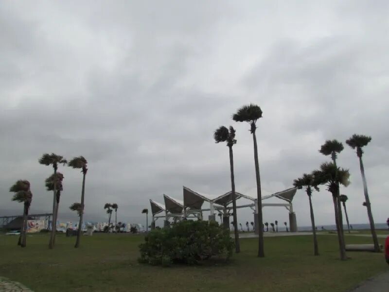 Picture this: a few towering coconut trees are scattered across lush green lawns, instantly giving off those quintessential tropical paradise vibes. The sky was doing its moody thing, all covered in clouds, and the wind? Oh man, it was *really* whipping!